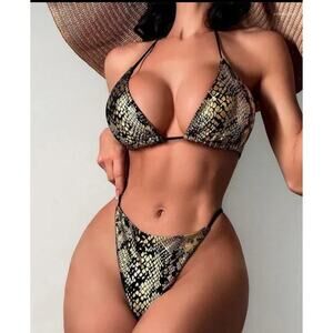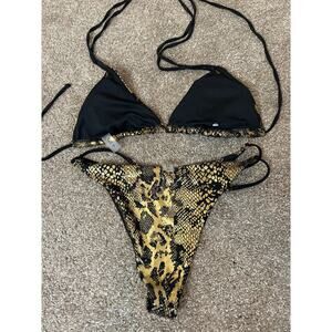 Bikini Beach snakeskin halter thigh high padded top gold/black swimsuit SZ M