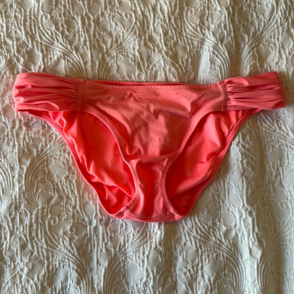 Victoria’s Secret bikini bottom in a peachy color size M. The sides have ruching and the last picture in natural light is the true color.