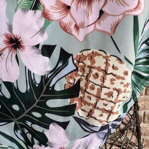 Mint Green background with all over white floral designs as well as pineapples & various shapes of palm tree fronds