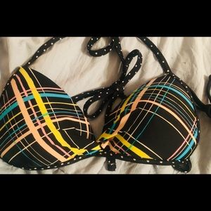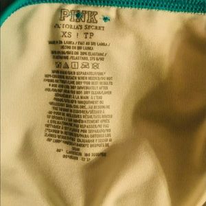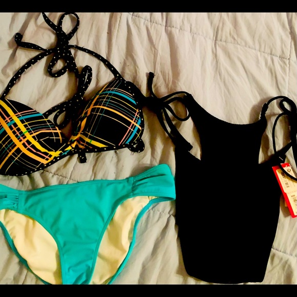Bikini bundle!! 1 top and 2 bottoms. The top is a size Medium but fits like a Small, it has a little padding in GUC. The black bottoms are NWT, size Medium & the turquoise or teal colored bottoms are size XS, fits XS-S in GUC AND by PINK/Victoria’s Secret.
