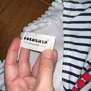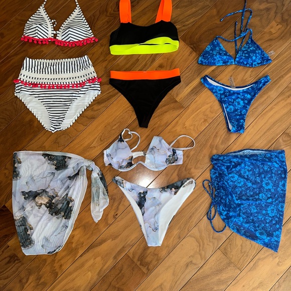 Diverse bikini set from SHEIN. Includes blue floral and black designs. Perfect for beach days. All for $30.