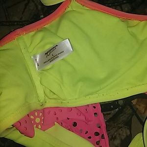 My Sister got it from Target last summer . warn a handfull of times . alittle bit of the pink has faded on some spots on the yellow . nothing major noticeable . the bottoms are XL and the top is Just a L. Super cute . exspecially since my sister is very tan lol .