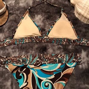 This is a No Boundaries bikini. Although, it’s a more economically friendly priced suit it’s the one that I got the most compliments on! Fits comfortably and covers moderately. Loved lots, but aside from some pilling on the inside of top it’s 💯% structurally intact.