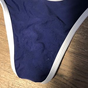 Navy blue and white. Worn some but in pretty good condition. Have a few pulls on the back shown in last picture. Has removable padding and high leg cheeky bottoms