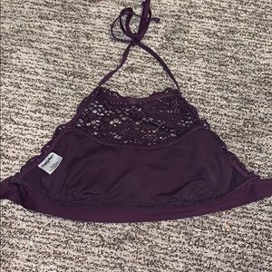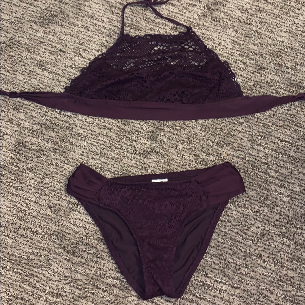 plum, worn a few times, in good condition, top is small, bottom is medium
