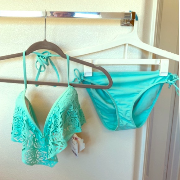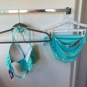 Teal bikini set - top is bra style with cut out fringe in front - bottoms have ties on the sides - new with tags