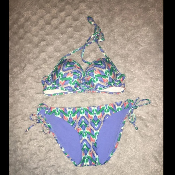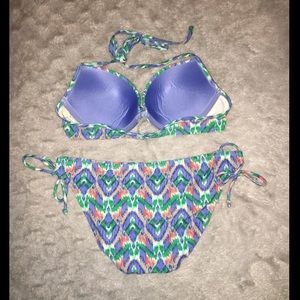 Blue printed bikini. Halter top size 36B. Bottom ties on sides, size M.