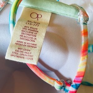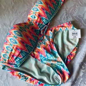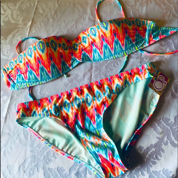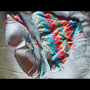 Fun, vibrant abstract designed bikini set! New with tags! Size XL (15-17). Material is nylon and spandex. Bikini top has strings to secure, top is lightly padded. Bottoms have full coverage, medium rise, classic fit. Update your swimwear with this cute addition. Comes from smoke-free home! Offers are considered! Thanks for looking!