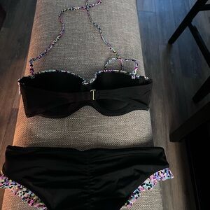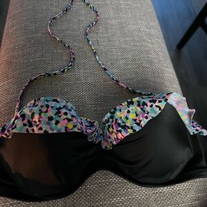 Victoria’s Secret size small. With a scrunch butt and underwire top. Removable straps for a halter or strapless fit. Black color with colorful ruffle’s