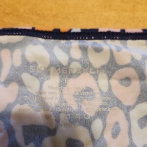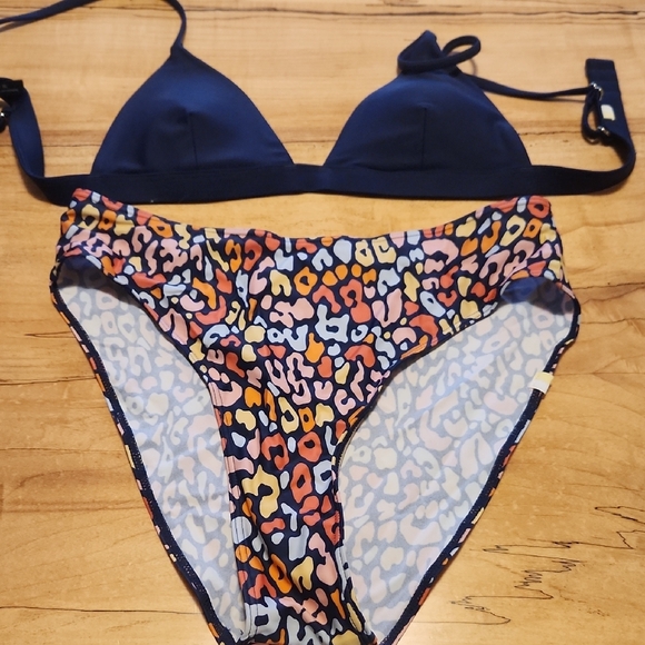Stylish women's bikini set featuring a navy top and a vibrant multicolor bottom. Perfect for a day at the beach or pool.