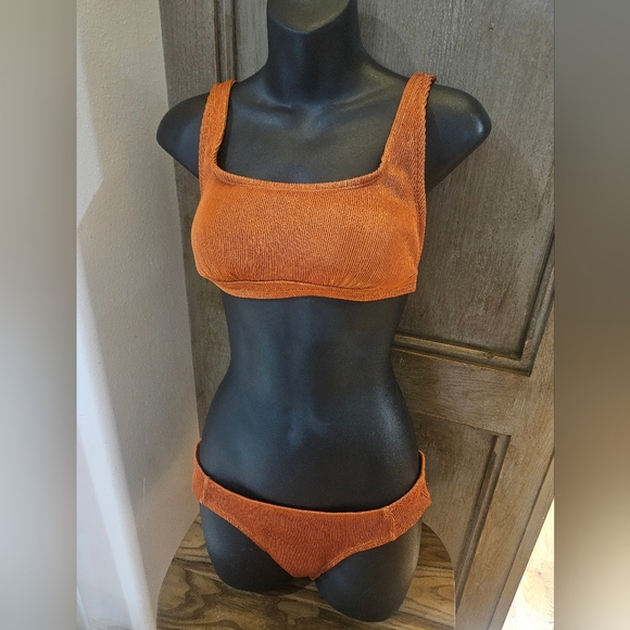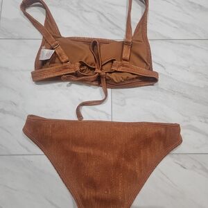 Stylish copper/burnt orange with hints of gold ribbed bikini set. Perfect for beach days.