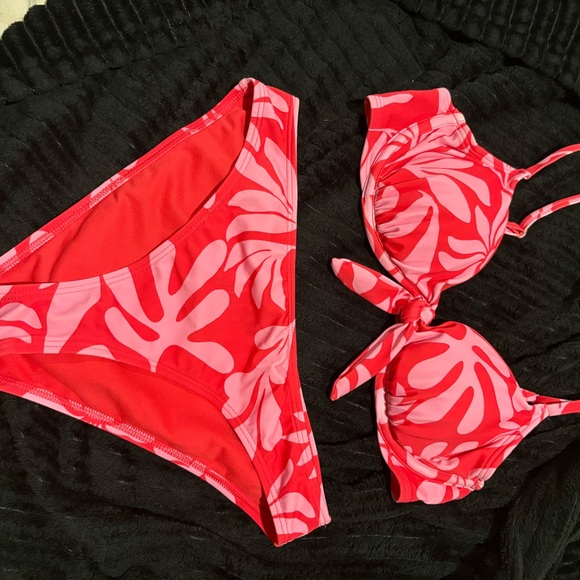 Stylish bikini set with a vibrant red and pink leaf print. Perfect for beach days.