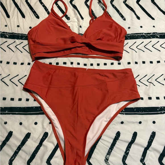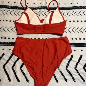 Stylish red bikini set with a twist front top and high-waisted bottoms. Perfect for the beach or pool.