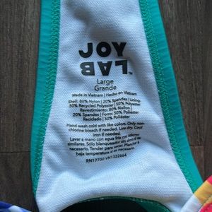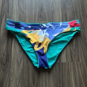 Two piece vibrant bathing suit in red, orange, yellow and green modern tropical print. High waisted high cut bottom and triangle halter top with athletic T Back. Removable pads. Double thick material prevents show through. EUC with no fading or pulling. Please refer to photos as they are a part of the description.