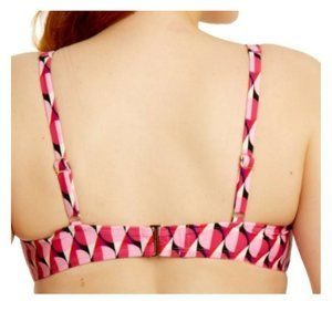 This pretty swim top in pink, black, and white geometric print has adjustable straps and plunging V-wire front. Adjustable to three widths on the back closure.