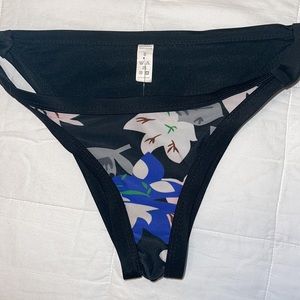 Beautiful little Bikini Pant edged in solid black with a Tropical Flare Print. Picture this black side Strap wrapped over your hip bone. Very cute and sexy. Soft Blue and gray print in front and back.