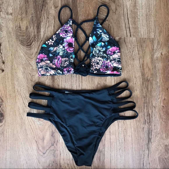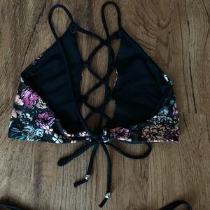Reversible bikini top with criss cross detailing on chest and back. The strings are adjustable which makes it great for fitting different sizes, I’d say small-large comfortably.