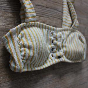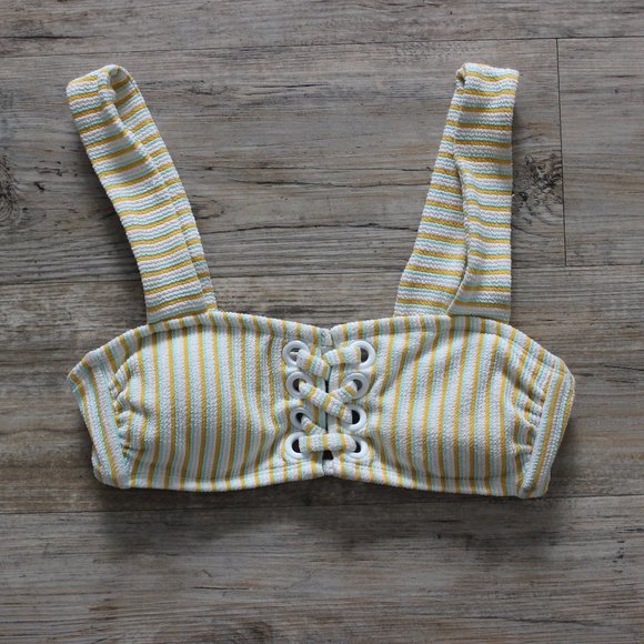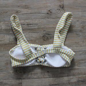 Yellow, teal, and white swim top with lace up front. Has been worn a couple of times and is in good condition.
