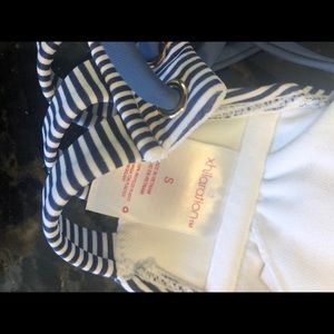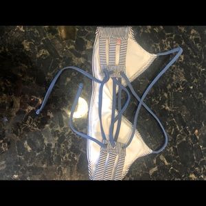 Navy and white stripes bikini top. Padded, removable cups. Strappy lace-up back. Tag says small, I’d say it’s a smaller small.