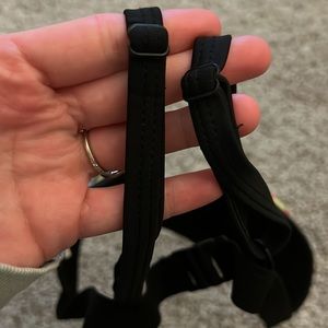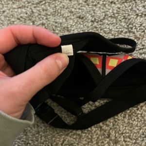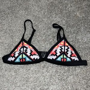 Patterned swim suit top. Adjustable straps and has a clasp in the back. Padding sewn in swimsuit. Colors- black, blue, yellow, coral.