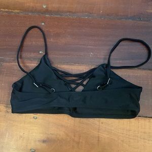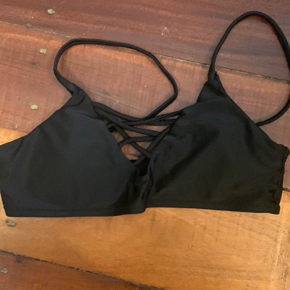 Black bikini top with strappy detailing on the front. Adjustable straps.