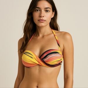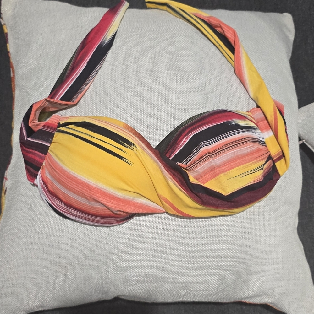 Gorgeous yellow, orange, and red striped bikini top — made in Brazil 🇧🇷