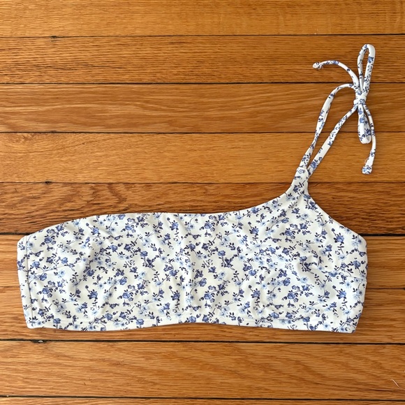 Stylish one-shoulder adjustable bikini top with a blue floral pattern.