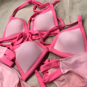 Contrast two toned bikini with a wrap style top and open tab side bottom. Top and bottom sold separately. Available in pink and blue. New without tags. Filter by “swim” to find coordinating options