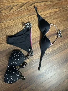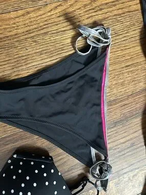 •Pink black and silver bikini set the bottoms are cheeky! •polka dot bikini top All are size large !!