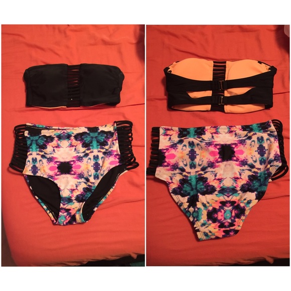 Multicolored bikini. High waisted bottoms. Stapless top. I would say bottoms are a S/M and top is a XS/S. Only worn once.
