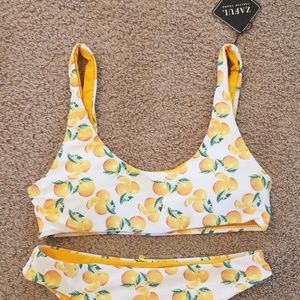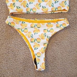 Orange print reversible bikini set.