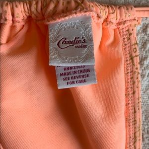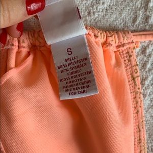 Tribal print peach colored bikini top and bottom with fringe front. Ties around neck and ties and sides of bottom.