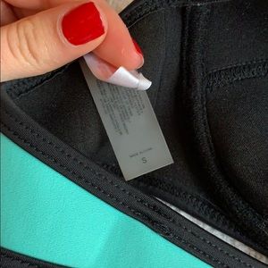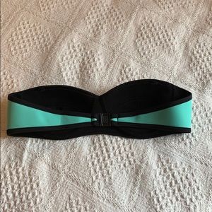 Turquoise, pink, and white triangle bikini. Clips in the back. Small. Strapless.