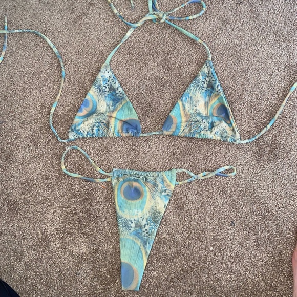Super cute pea cock print bikini set. Never worn. Bottoms are size xs/a and bikini top is size M.