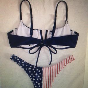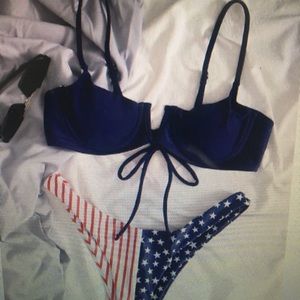 Blue underwire bikini top. Brand new. I ordered a bunch of suits not realizing there is a no return policy and this one was too small. Brand new with tags and will ship ASAP. Also have the bottoms in the picture available in a small if you want to bundle.