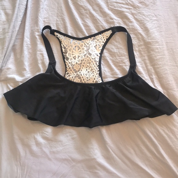 Cute black bikini top with white lace back design. Good condition. Make me an offer!