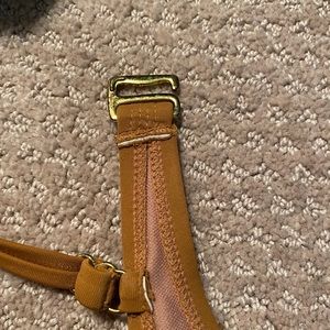 The color of it is more of like a bronze and it has a little sparkle to it really pretty in the light. Crosses over in the middle.