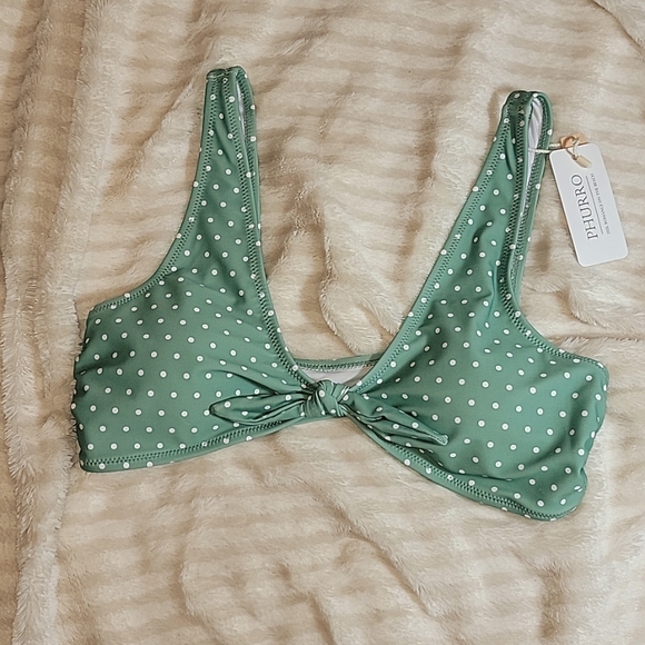 Light dusty green top with white polka dots. Tie in the middle is an accent. Tag says xl but in my opinion it fits more like a large. If you're large chested, this would most likely not work, maybe a b or small c.