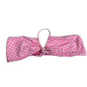 Betty Jade bikini top, convertible top (bandeau, front halter, cross front halter, one shoulder, bralette), bright pink and white checkered, large, new with tags but has a spot on the back that should wash off