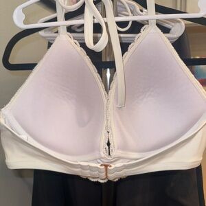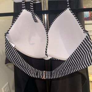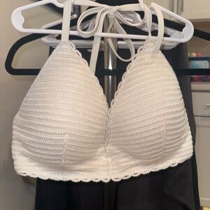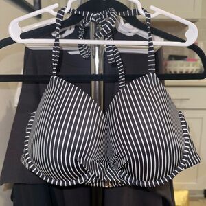 2 bikini tops with back hook closure and halter style tie behind neck.