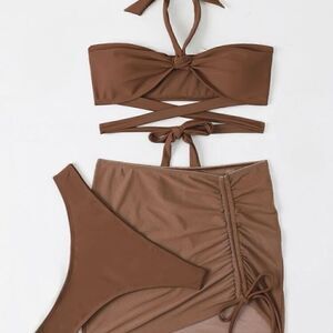 Three piece set: bikini top, beach skirt and bikini bottoms included.