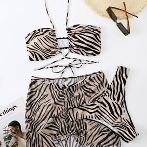 Three piece set: bikini top, beach skirt and bikini bottoms included.