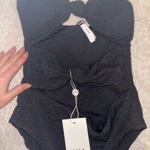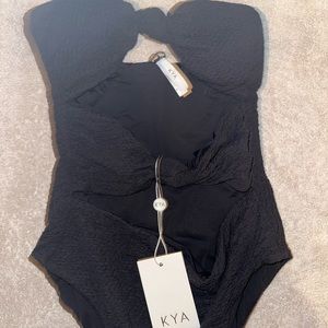 Bikinis from KYA. Reversible Fallon One Piece in Onyx Scrunch & Onyx. Dark blue