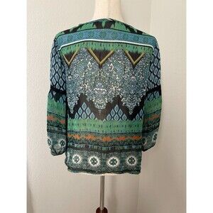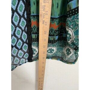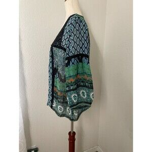 This Bila boho peasant blouse is the perfect piece for carefree, eclectic style. Made from lightweight 100% rayon with sheer flowy fabric, it features a vibrant multicolor patchwork print in shades of green, blue, and orange with a contrasting black crochet neckline. The relaxed silhouette, billowy sleeves, and bohemian detailing make it ideal for casual wear, music festivals, or layering with jeans and skirts for a free-spirited vibe.