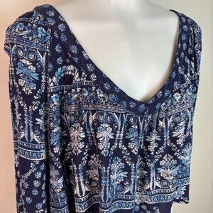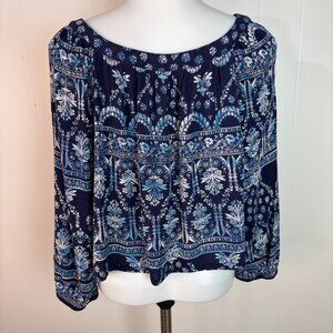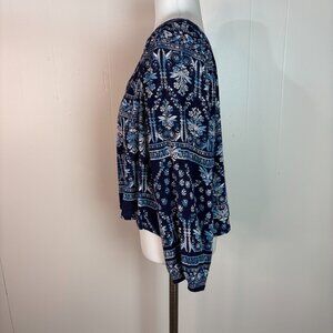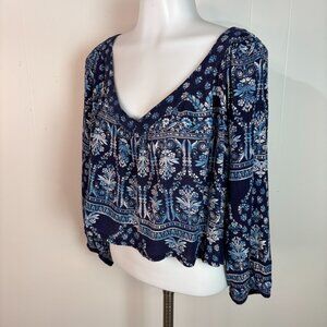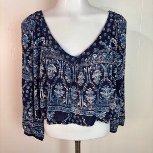 Bila Crop Top Large Blue Boho Floral V-Neck 3/4 Sleeve Blouse Women