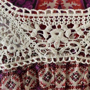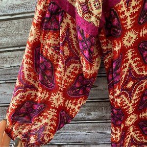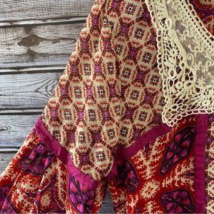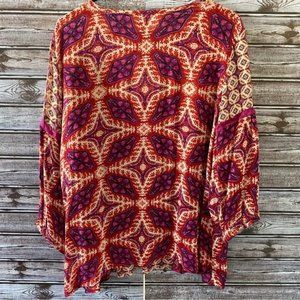 This Women's Semi-Sheer Blouse by Bila is a Size L and is made of 100% Rayon. It has a multi-colored print with a crocheted detail on the front and 3/4-Length Sleeves as shown. Gently used. Great Condition!