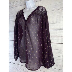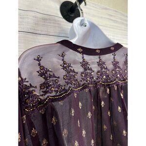 Bila Top Women XXL Burgundy Sheer Popover V Neck Long Sleeve Beaded Embroidered