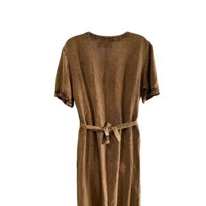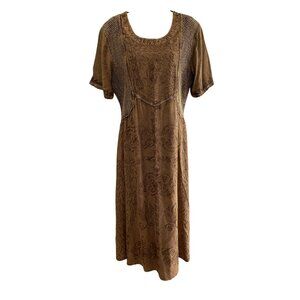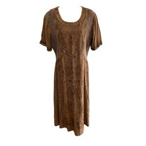 Bila Womens Brown Boho Embroidered Midi Dress L 100% Rayon Short Sleeve Tie Back