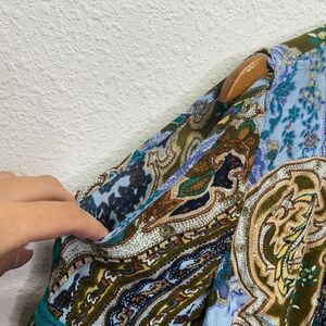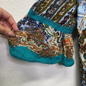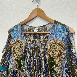 Keywords: Bila blouse, women's top, paisley pattern, bohemian style, artsy fashion, scoop neck, bell sleeves, multicolor blouse, casual wear, XL blouse, pre-owned clothing.