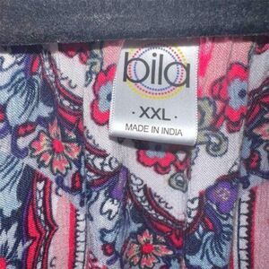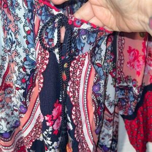 This Bila blouse is a women's XXL tunic featuring a multicolor floral pattern with bohemian and paisley themes. Made from lightweight rayon, it has a flowy fit with a wide neckline and long bell sleeves accented with tassels. Suitable for casual occasions, this regular fit blouse is manufactured in India. The item is pre-owned. Please see last picture for callout.